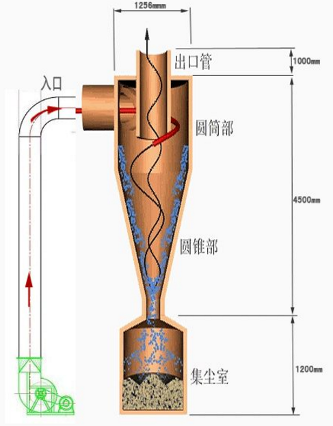 旋风除尘器是利用旋转气流所产生的离心力将尘粒从合尘气流中分离出来的除尘装置。旋转气流的绝大部分沿器壁自圆简体,呈螺旋状由上向下向圆锥体底部运动,形成下降的外旋含尘气流,在强烈旋转过程中所产生的离心力将密度远远大于气体的尘粒甩向器壁,尘粒一旦与器壁接触,便失去惯性力而靠入口速度的动量和自身的重力沿壁面下落进入集灰斗。旋转下降的气流在到达圆锥体底部后.沿除尘器的轴心部位转而向上.形成上升的内旋气流,并由除尘器的排气管排出。